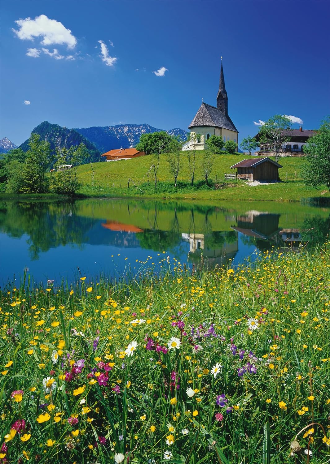 Travel to the country with this lakeside view of St. Nicholas Church. Manufactured to Schmidt’s Premium Quality 6 Star-Quality. The six unique advantages are: 1. Great variety of forms thanks to individually shaped pieces. 2. Perfect cohesion thanks to specially-developed cardboard which is 2.25 mm thick. 3. Perfect accuracy of fit thanks to an especially fine punching knife. 4. Special matt varnish for jigsaw puzzles without reflections. 5. Linen structure. 6. Exclusive design. Combined, the quality and fit of Schmidt’s six star quality means that a 1,000 piece puzzle can be lifted up vertically once complete without the need of any puzzle conserver making this jigsaw a satisfying experience for any puzzle lover. The complete puzzle measures: 493 mm x 693 mm.