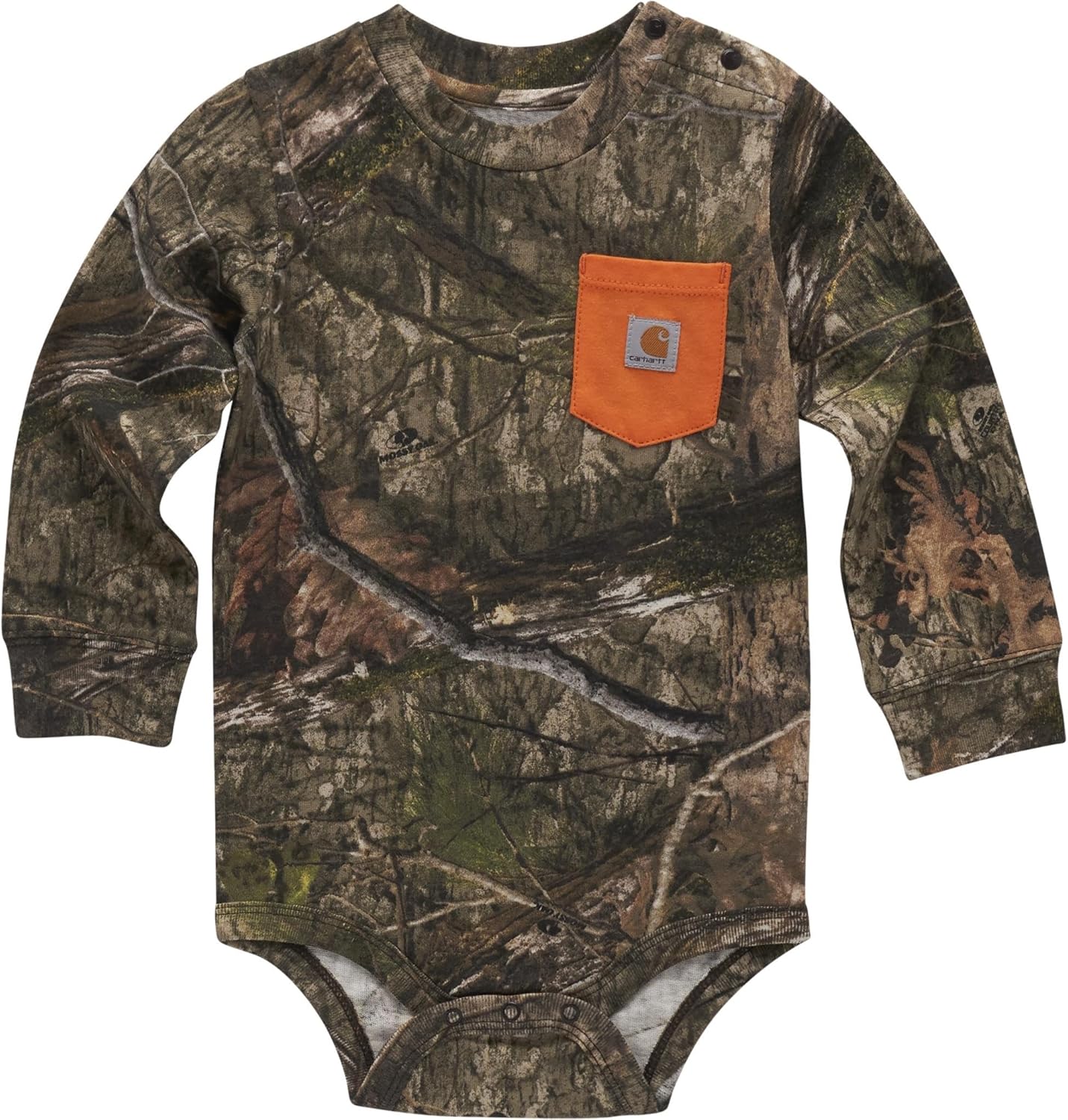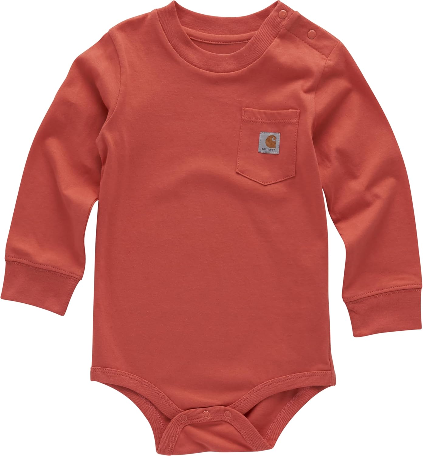 This long-sleeve cotton bodysuit from Carhartt is made for babies who are born to explore. Whether they’re rolling, crawling, or just snuggling up with a favorite blanket, this comfy one-piece delivers all-day softness and dependable durability. The 100% cotton fabric is gentle on sensitive skin and breathable enough to handle active days or cozy naps.Designed with parents and caregivers in mind, this bodysuit features shoulder snaps for easy on-and-off changes, plus bottom snaps to simplify diaper duty. The signature Carhartt logo patch on the front chest pocket adds a little rugged charm—perfect for little adventurers in the making.From everyday playdates and daycare to family gatherings and outings, this versatile baby tee//top layers beautifully under jackets or works on its own. The lavender color makes it a gender-neutral favorite, while the quality construction means it can be worn, washed, and passed down again and again.Whether you're shopping for your own little one or looking for a thoughtful baby shower gift, this Carhartt baby bodysuit blends style, comfort, and function in one perfect piece.