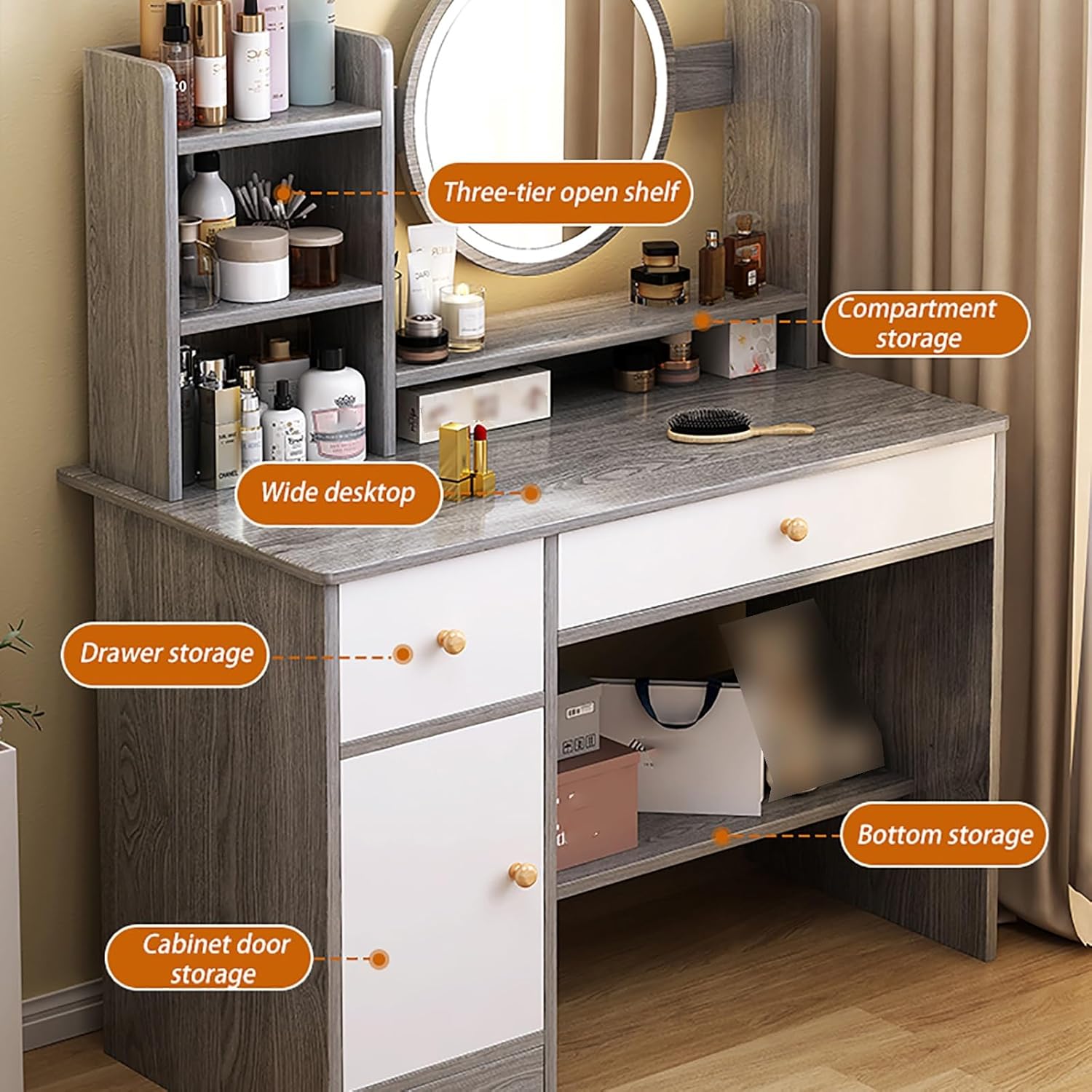 Dressing Table with Flip-top Mirror and Rolling Stool LED Lights Integrated Makeup for Small Spaces,Discover the ultimate dressing cabinet that marries style and functionality in one elegant design. This versatile dressing table features a spacious desktop, multiple drawers, and ample storage cabinets, making it the perfect solution for organizing your cosmetics, jewelry, and other small items. Say goodbye to clutter and enjoy a beautifully tidy space that enhances your daily beauty routine. Equipped with a stylish mirror and innovative touch-sensitive buttons, this dressing table allows for easy control of the LED lighting, creating the ideal ambiance for your grooming needs. The built-in LED lights are conveniently managed through a safe and intuitive screen button, ensuring a seamless experience every time you use it. One of the standout features of this dressing cabinet is its flexibility. When you remove the mirror, it transforms effortlessly into a writing desk, making it a perfect addition to any bedroom, bathroom, or office. Its modern and elegant design complements various decor styles while providing practical solutions for your everyday needs. Specifications: Name: Dressing Table SetMaterial: WoodAdditional Features: Removable MirrorStyle: Simple, Modern, ElegantAssembly Required: YesPackage Contents: 1 x Table1 x Mirror1 x StoolAt our store, you can explore a wide range of styles to find the perfect match for your home. Please note that due to variations in monitor settings, slight color differences may occur. If you have any questions or require assistance, feel free to reach out via email, and we will respond promptly to ensure your satisfaction.