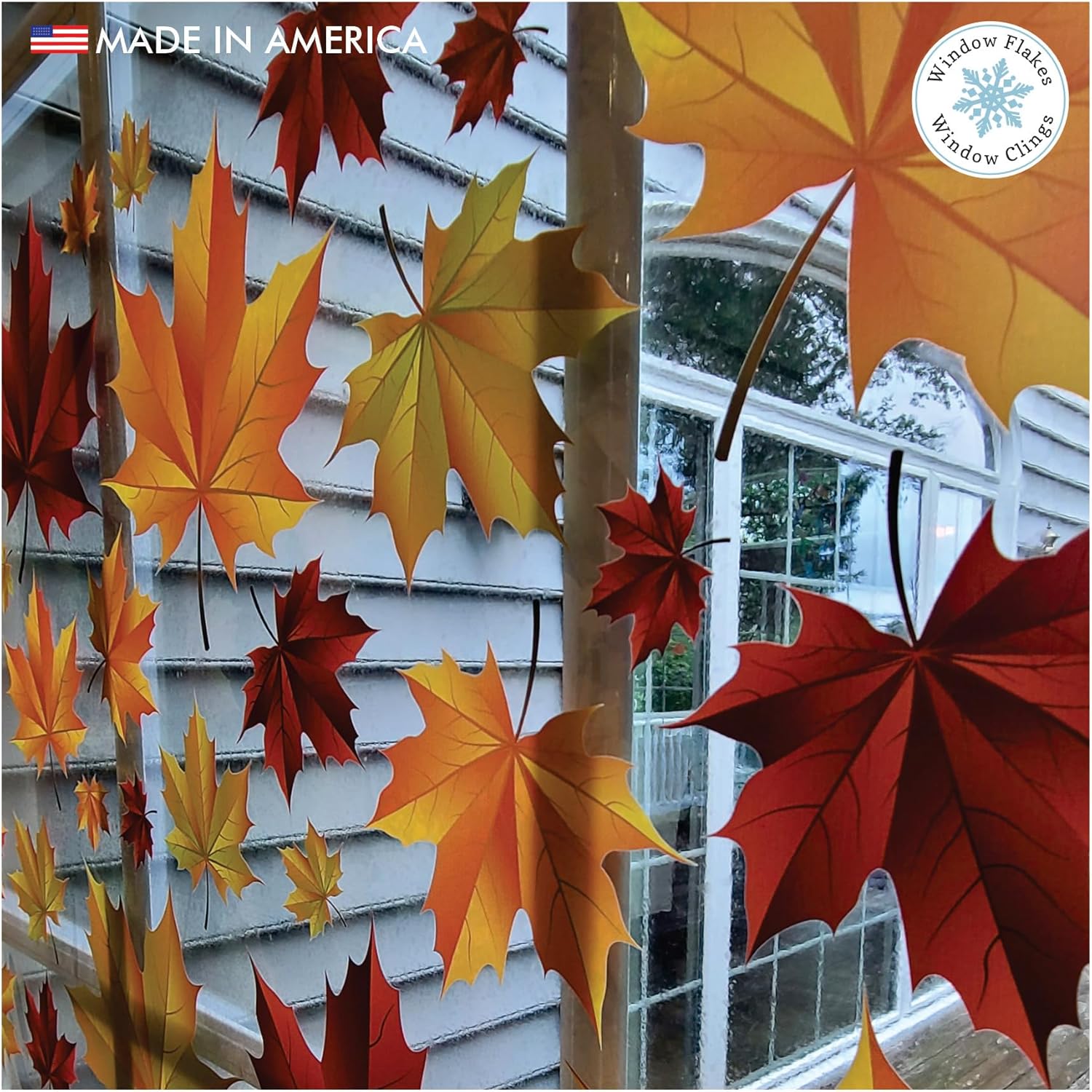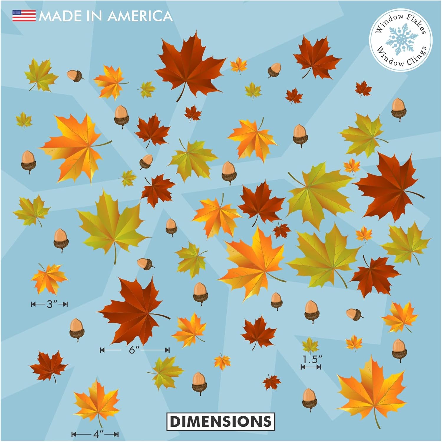 One of our most popular items, these 77 piece individual Fall Leaves and Acorns of varying sizes can be positioned any way you’d like on your mirrors and/or windows. They are printed double-sided in beautiful, vibrant, realistic shades of crimson, red, orange, yellow and green, and are the perfect complement to your Fall/Halloween/Thanksgiving décor. Ideal for home, school, cafe, restaurant, and retail store window displays.