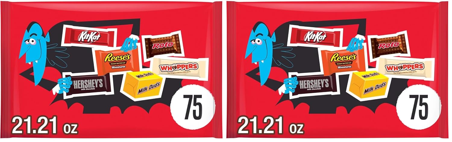 Enjoy a delicious treat anytime and anywhere with an assorted bag of Hershey miniature candies, perfect for handing out as trick or treat candy or filling candy bowls at your Halloween party. Offering six crowd pleasing favorites, this Halloween candy bag is perfect for sharing with family, friends, teammates or co-workers. Take this variety candy bag into the office break room, pour some individually wrapped candies into your jar at home or take a bag to your next sports game to celebrate the win. This assorted bag of kosher candy includes REESE'S milk chocolate peanut butter cups candy, ROLO rich chocolate caramel candy, MILK DUDS chocolate caramel candy, WHOPPERS malted milk balls candy, KIT KAT milk chocolate wafer bars, and HERSHEY'S milk chocolate candy bars.
